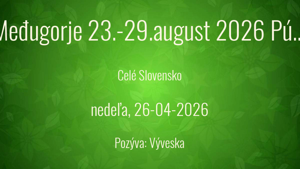 Međugorje 23.-29.august 2026 „Púť Panny Márie, Kráľovnej pokoja“ Ahojte čoskoro ideme na najúžasnejšie miesto aké som vo svojom živote navštívil. Pre mňa osobne je to miesto, ktoré by som najviac definoval jedným slovom: POKOJ.