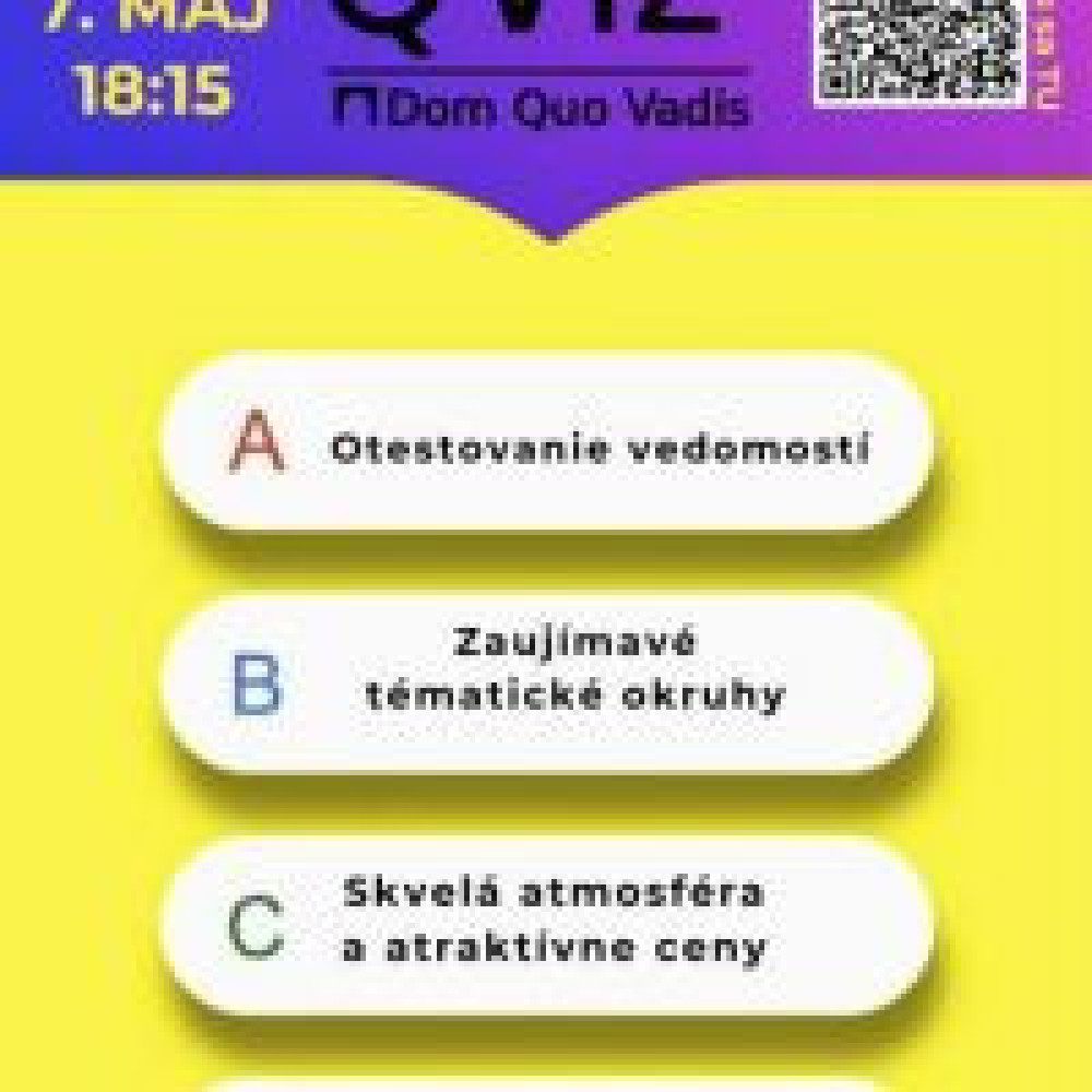Ukáž čo je v tebe. Prihlás svoj tím, alebo sa prihlás sám a my ťa zaradíme do tímu. Kedy? Štvrtok 7. mája o 18.15 Kde? Dom Quo Vadis, Veterná 1, Bratislava Koľko členov môže byť v tíme? 3-4 členovia. Vstupné - dobrovoľný príspevok na chod Quo Vadis (odporúčané 5€) Prihlasovanie TU